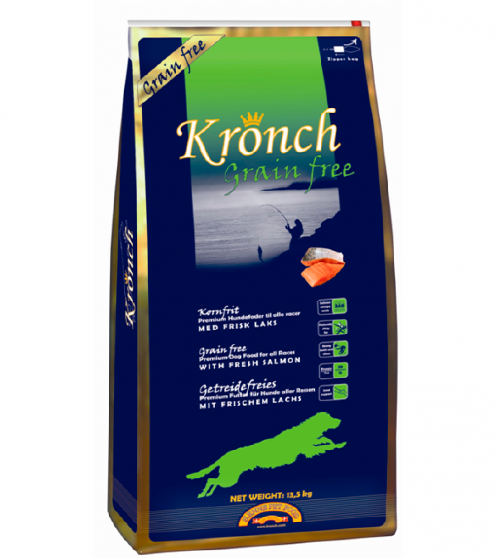 Kornfrit premium fuldfoder til hunde med normalt energibehovKronch Grain free er et sundt og velsmagende fuldfoder af høj kvalitet baseret på frisk laks, kartoffel og bønner.