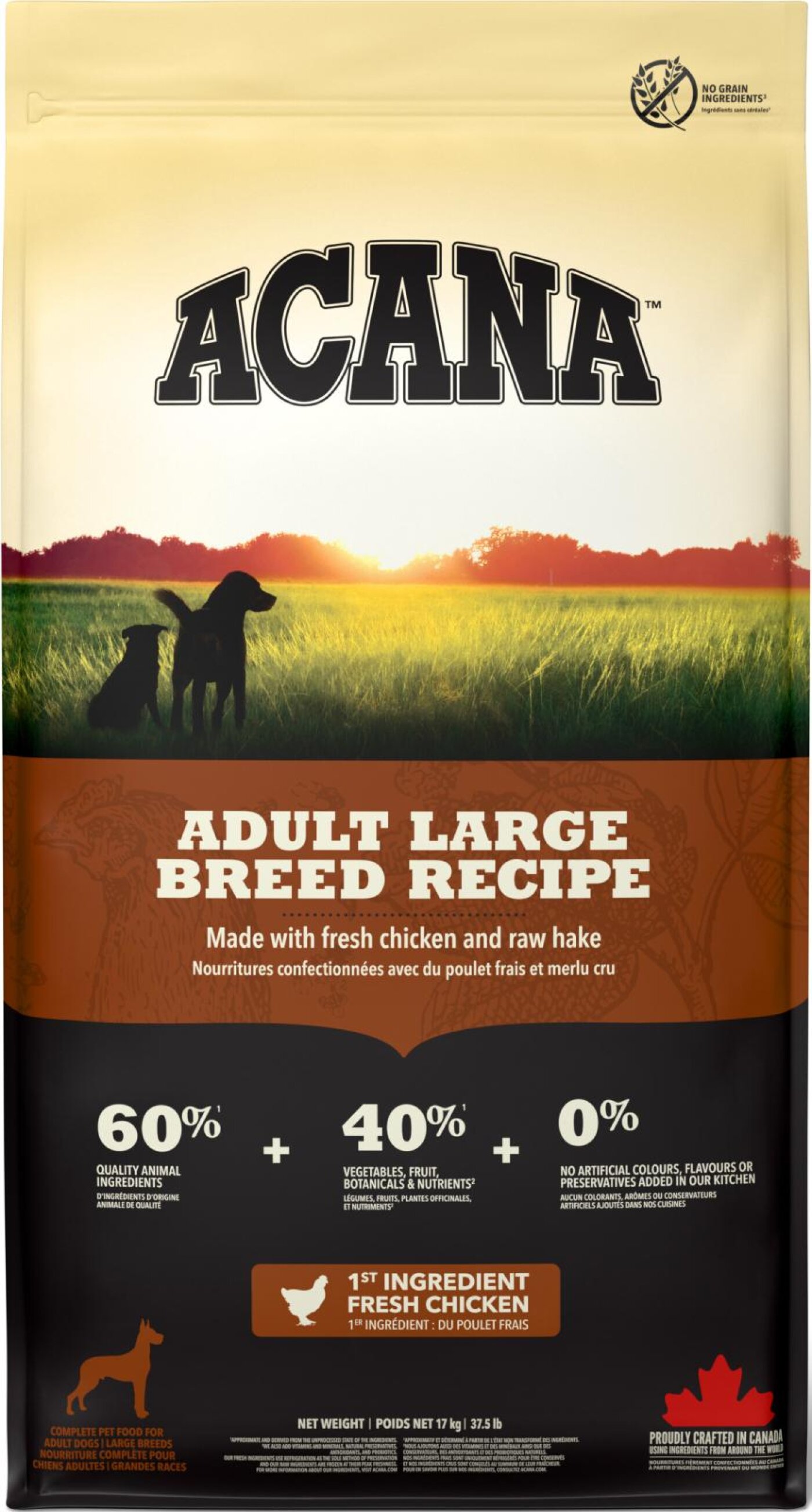 ACANA™ Adult Large Breed Dog Recipe tørfoder er lavet med proteinrige animalske ingredienser, herunder fersk kylling, rå kulmule og frugt og grøntsager, som din hund har brug for til at forblive glad, sund og stærk. Disse kibbles hjælper med at fremme mager muskelmasse, minimerer stress på knogler og led samt understøtter sund hud og pels. De indeholder kun kvalitetsingredienser og ingen korn, kunstige smagsstoffer, farver eller konserveringsmidler.