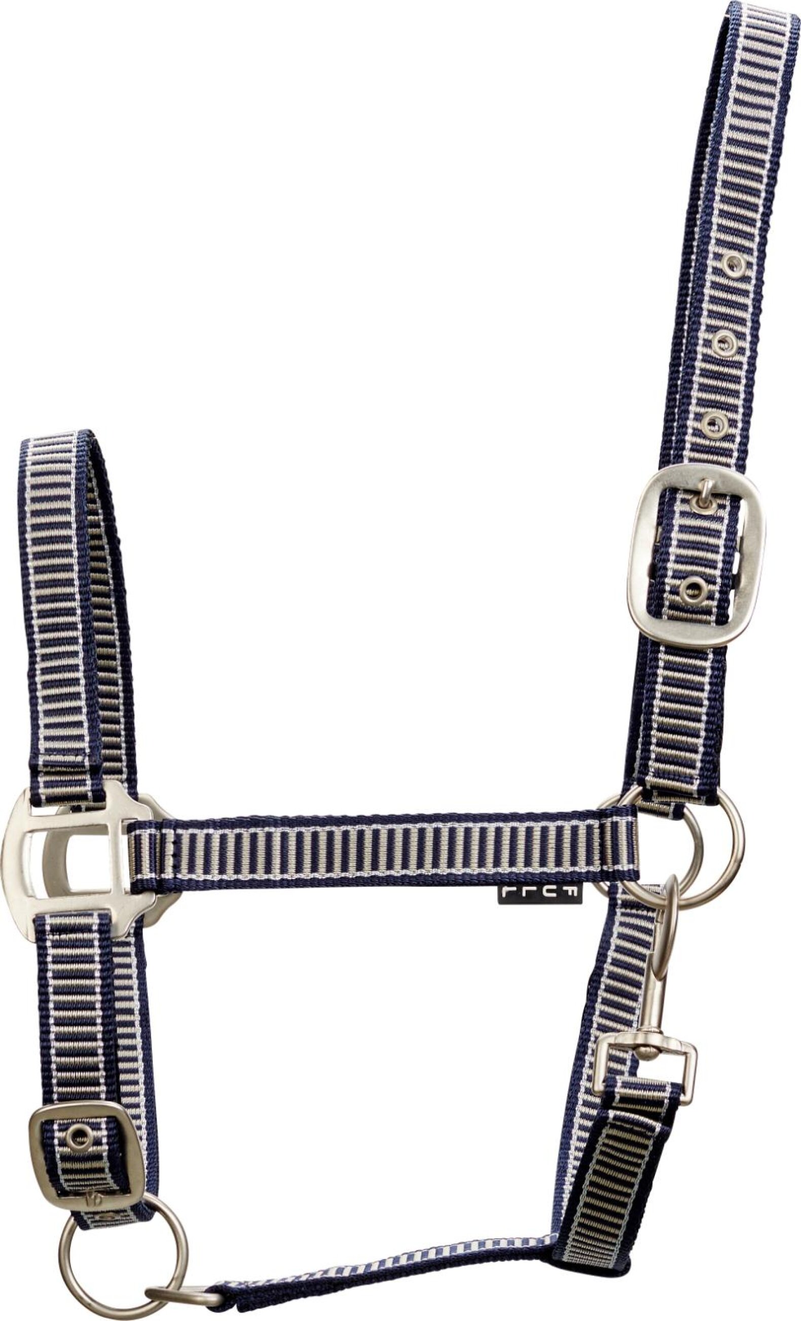 Flot elegant tofarvet stribet smal nylongrime med matte sølvfarvede kraftige spænder. Justerbar ved nakkerem og under kæben.30 dages returret