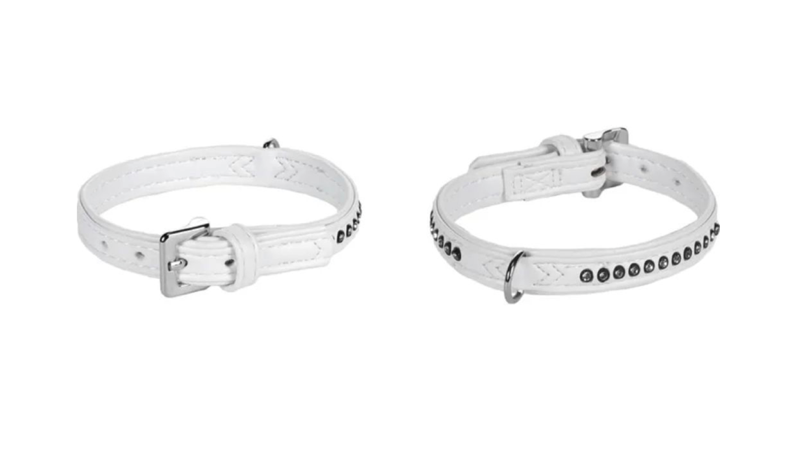 Halsbånd til hunde i hvidt kunstlæder af mærket Flamingo.Med en række flotte blanke sten.