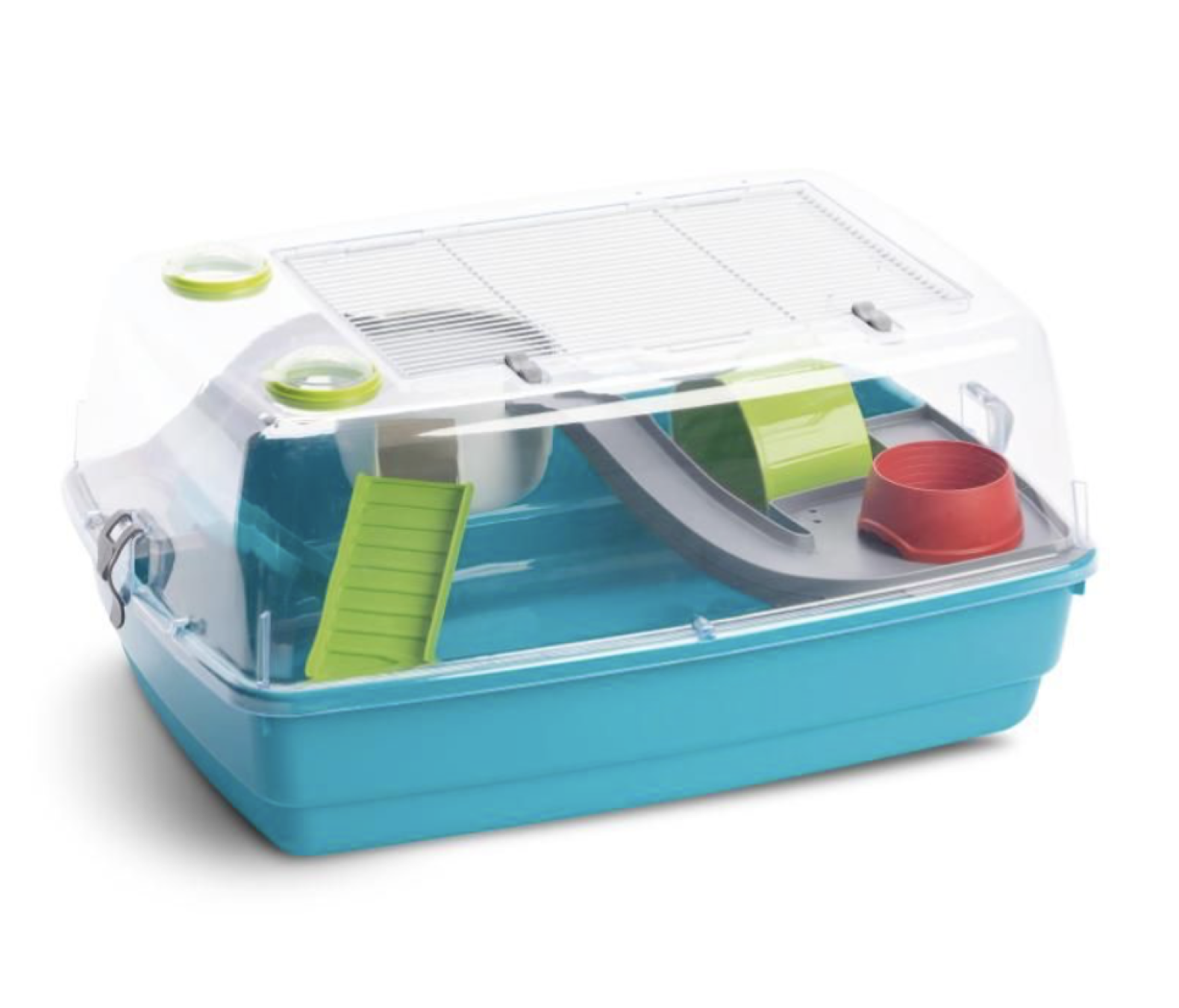 Hamsterbur Bernie fra firmaet MPS2. Praktisk bur i plast med gitterlåge i taget. Med hus, løbehjul, skål, platforme og stiger i plast. Velegnet til små gnavere som hamstere og mus.30 dages returret