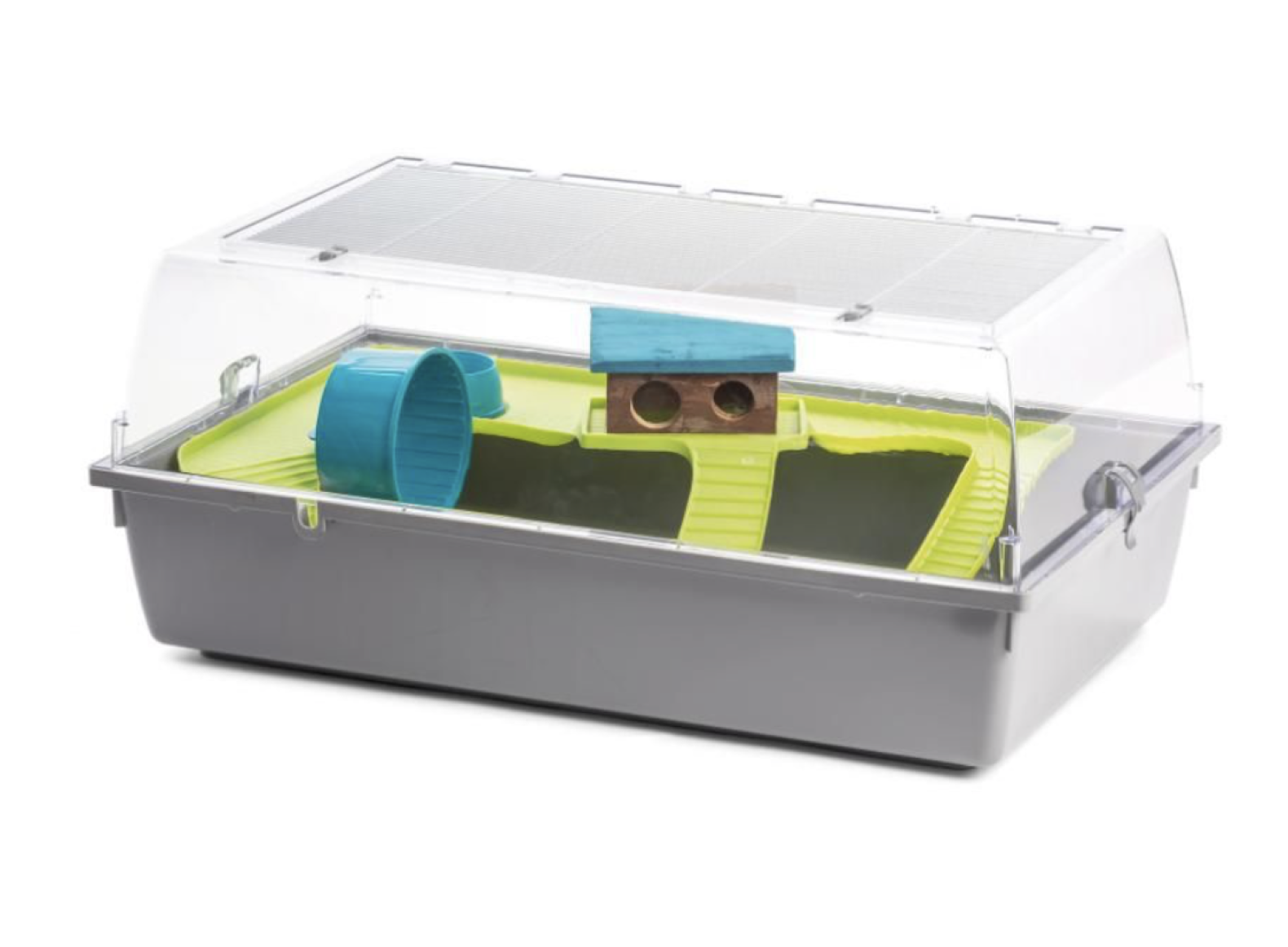 Hamsterbur Tamburino Fun fra firmaet MPS2. Praktisk bur i plast med gitterlåge i taget. Med hus, løbehjul, skål, platforme og stiger i plast. Velegnet til små gnavere som hamstere og mus.30 dages returret