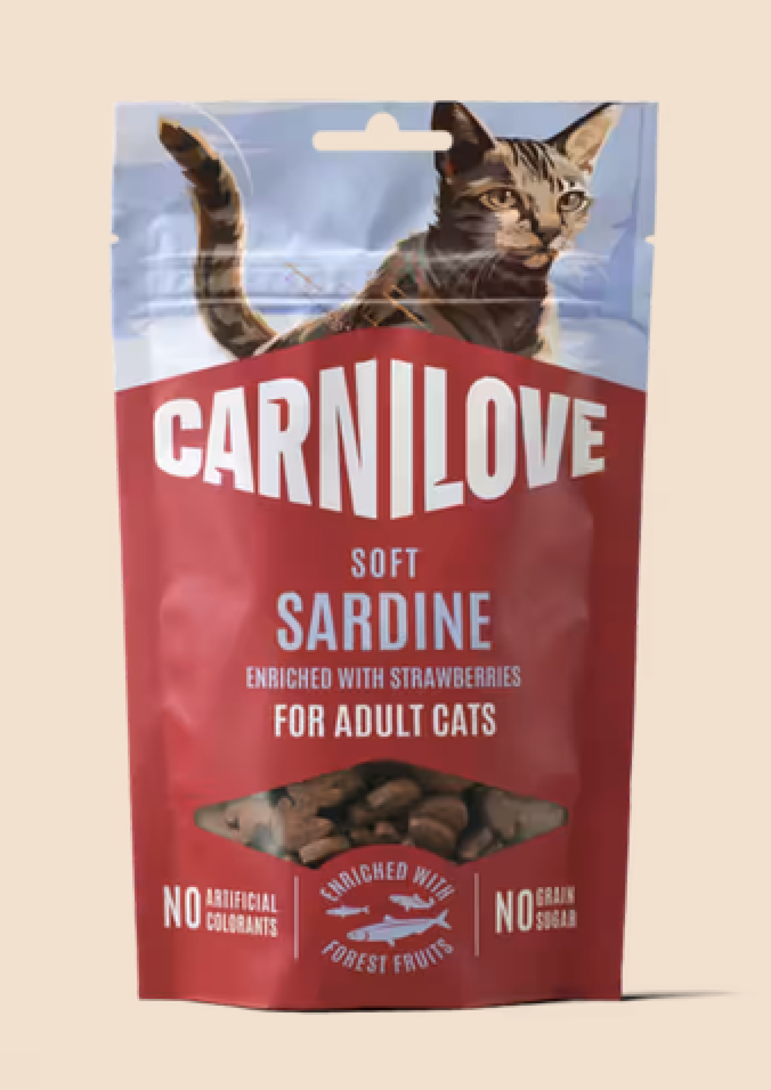 Sardine protein (26%), yellow peas, glycerol of vegetable origin, hydrolysed chicken liver, hydrolysed chicken protein, whey, collagen, molasses, potassium chloride, dried strawberries (0.5%).30 dages returret